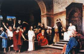 Ám ezek után mégsem hajtották végre az ítéletet, a római helytartó elé hurcolták Jézust. A rómaiak ugyanis fenntartották maguknak a pallosjogot. Emiatt fordulhatott elő korábban, hogy a házasságtörő asszony esetével akarták tőrbe csalni Jézust - ugyanis ha felmenti az asszonyt, a zsidó törvényt szegi meg; ha elítéli őt, akkor pedig a római törvényt sérti. Jól ismert mondásával Jézus akkor fantasztikusan bújt ki a csapdából: "Aki közületek bűn nélkül van, az vessen rá először követ." Tehát Jézus perében a szanhedrin törvénytelenül járt el, nem mondhatta volna ki a halálos büntetést.